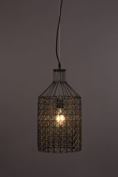 內部的燈泡在點亮時,溫暖光線透過交錯的金屬網格散射,投射出細緻的光影紋路,為空間帶來工業風與現代感兼具的氛圍。整體造型修長,線條俐落,適合用於餐桌上方、吧檯或高挑空間,成為視覺焦點。