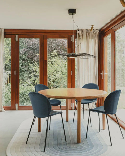 Storm 餐桌以圓潤細緻的收邊造型、厚實的木質桌面與穩固有力的桌腳,構成極具存在感的設計輪廓,使其成為空間中的視覺焦點。桌體採用白蠟木製作,桌面呈現優雅的 V 型溝槽紋理,為整體增添細膩且富層次的設計細節。